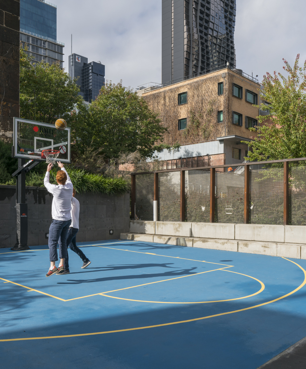 The RMIT University City Centre Basketball Court project consisted of; the refurbishment of the Court, the installation of new goal posts, new ground and surface lines and markings, and landscape lighting levels.